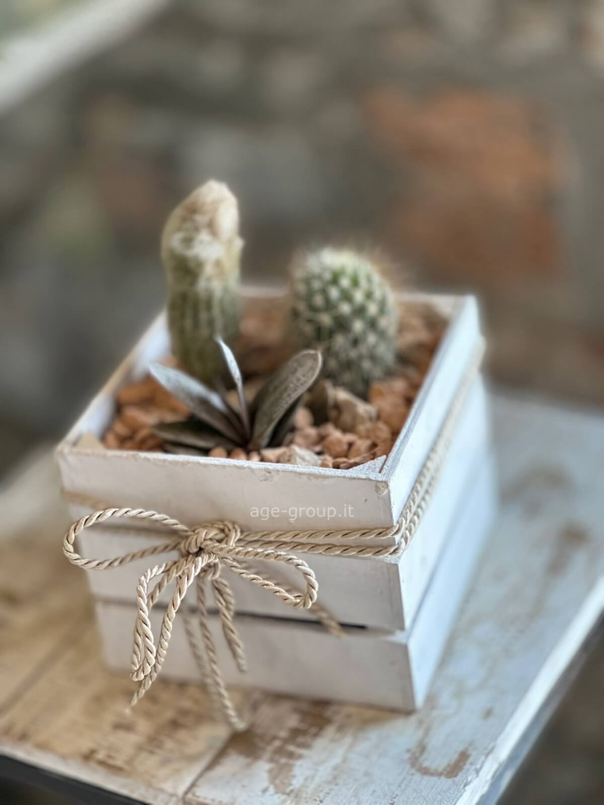 Un piccolo angolo di natura che dura nel tempo: composizione di cactus e succulente in elegante cassetta di legno bianca, rifinita con cordino in stile rustico.